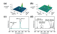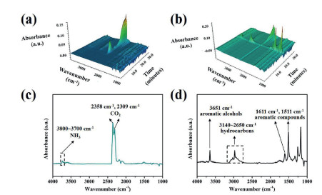 | Fig. 9. The 3D TG-IR spectra of the gas phase products during the total thermal degradation process for (a) HCA-EP-DDM and (b) E51-DDM. The FTIR spectra of the gaseous products at temperature of the maximum decomposition rate of (c) HCA-EP-DDM and (d) E51-DDM. | |