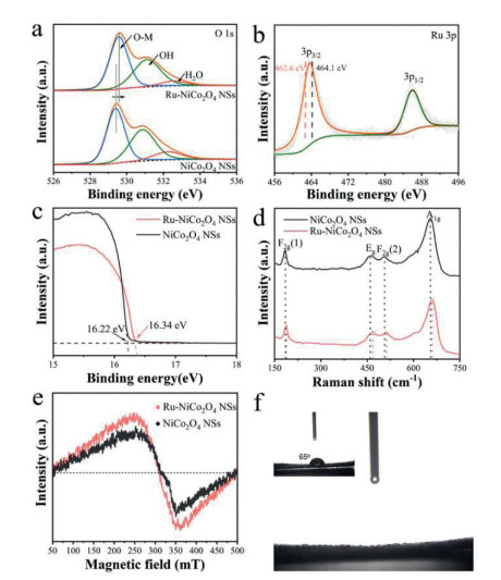 | Fig. 2. (a) O 1s spectra of Ru-NiCo2O4 NSs and NiCo2O4 NSs. (b) Ru 3p spectra of Ru-NiCo2O4 NSs. (c) UPS spectra (d) Raman spectra and (e) ESR spectra of Ru-NiCo2O4 NSs and NiCo2O4 NSs. (f) Contact angle of water droplets on the surface of Ru-NiCo2O4 NSs and bare CFC (inset). | |