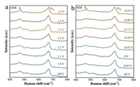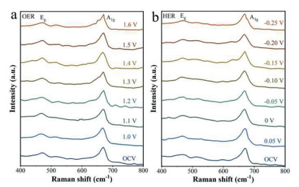 | Fig. 4. In situ Raman spectra of Ru-NiCo2O4 NSs during (a) OER and (b) HER. | |