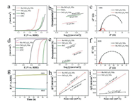 | Fig. 3. Electrochemical performance for OER and HER. (a) LSV curves and (b) the corresponding Tafel plots of Ru-NiCo2O4 NSs, NiCo2O4 NSs and RuO2 for OER., (c) EIS of Ru-NiCo2O4 NSs and NiCo2O4 NSs for OER. (d) LSV curves and (e) the corresponding Tafel plots of Ru-NiCo2O4 NSs, NiCo2O4 NSs and Pt/C for HER. (f) EIS of Ru-NiCo2O4 NSs and NiCo2O4 NSs for HER. (g) Chronopotentiometry test of Ru-NiCo2O4 NSs for OER and HER at 10 mA/cm2. (h, i) Capacitive currents of Ru-NiCo2O4 NSs and NiCo2O4 NSs with different scan rates for OER and HER, respectively. | |
