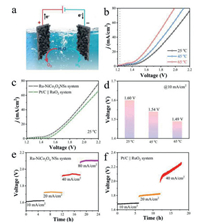 | Fig. 5. (a) Schematic illustration of the configuration of alkaline overall water splitting device. (b) LSV curves for overall water splitting applying Ru-NiCo2O4 NSs as both cathode and anode at different temperatures. (c) LSV polarization curves of Ru-NiCo2O4 NSs system and Pt/C||RuO2 system for overall water splitting at 25 ℃. (d) Comparison of the cell voltages to reach the current density of 10 mA/cm2 of Ru-NiCo2O4 NSs system at various temperatures., (e, f) Long-term stability test of overall water splitting at various current density of 10, 20, 40 and 80 mA/cm2 for Ru-NiCo2O4 NSs system and Pt/C||RuO2 system, respectively. | |