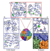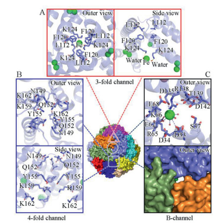 | Fig. 2. Channel structures of Uurf. (A) 3-fold channel. (B) 4-fold channel. (C) B-channel. All of the structures are represented in cartoon or surface presentations and related key residues in stick presentation. Green spheres and small red spheres represent iron atoms and water molecules. The 3-fold channel is labeled with a red triangle, the 4-fold channel is labeled with a blue square and the B-channel is labeled with a black circle. | |