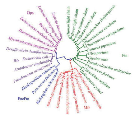 | Fig. 4. Ferritin phylogenetic tree shows the relationships between Ftns, EncFtns, Bfrs, Dps', and Mfrs. | |