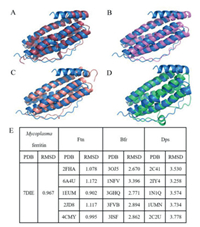 Mycoplasmas, belonging to the clad Molticutes, contain various pathogens, causing various diseases in human and animals [31]. The Mycoplasmas have minimal genomes, and the proteins they encoded are essential to their self-replication. Unexpectedly, some Mycoplasmas species (Mycoplasmas penetrans, Mycoplasma iowae, and Ureaplasma urealyticum (Uurf), for instance) encode ferritin proteins, indicating their importance for their life cycle, although the details of the function and structure of these proteins are completely unknown. Hence, there is a pressing need to investigate their properties, which could help researchers predict which ferritin subfamily they belong to.