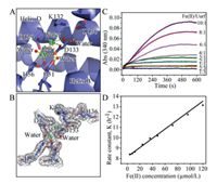 | Fig. 3. (A) Detailed structure of the ferroxidase center of Uurf. The interactions of Fe (green), water (red), and ligand residues as well as hydrogen bonds are indicated by dotted lines. (B) A Fo-Fc omit map contoured at 1 σ around the ferroxidase center of Uurf is shown as a gray mesh. Residue D51 in this center has dual conformations. (C) Iron oxidation activity of Uurf. (D) Plot of observed (pseudo-first order) rate constants obtained from fitting the data as a function of Fe(Ⅱ) concentration. | |