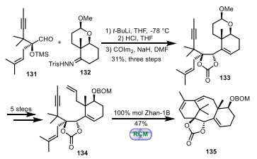 In 2016, Prunet and co-workers applied a ring-closing dienyne metathesis reaction to the synthesis of 6−8−6 tricyclic core of Taxol [91-98]. The Shapiro coupling reaction of aldehyde 131 with trisylhydrazone 132, hydrolysis of the trimethylsilyl ether and protection of the diols gave the carbonate 133. Then a five-step sequence of hydrolyzation, reduction, and elimination using the Grieco protocol was carried out to furnish the metathesis precursor 134. With enyne 134 as cyclic precursor, the desired tricycle product 135 with A/B/C ring was obtained in 47% yield through tandem metathesis reaction (Scheme 24).