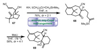 In 1995, Martin and co-workers achieved the 6−8−6 tricyclic ring of taxane via an anionic oxy-Cope rearrangement protocol [66]. The crucial anionic oxy-Cope rearrangement reaction of alcohol 67, followed by alkylation in situ, furnished the bicyclo[5.3.1]undecenone 68 in 76% yield with 2:1 ratio of diastereoselectivity. Finally, exposure of excess MeLi by a vinyllithium reagent generated tricyclic compound 69 in 58% yield (Scheme 11).
