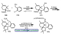 In 1997, Nagaoka and co-workers described the synthesis of 6−8−6 tricyclic core of Taxol via Friedel−Crafts type cyclization [108]. Initially, the coupling of ring A precursor 169 with aryllithium reagent 170 gave alcohol 171 as a mixture. Then the major isomer of 171 was transformed into nitro compound 172 through an eight-step sequence. Treatment of precursor 172 with excess p-chlorophenyl isocyanate afforded tricyclic product 173 in 94% yield (Scheme 31).