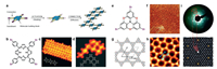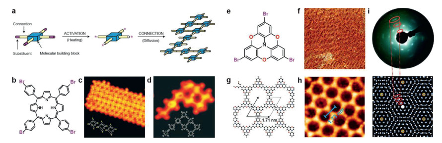 | Fig. 11. Surface-mediated polymerization. (a) Concept of the formation of covalently bound networks by connecting activated molecular building blocks. (b) Chemical structure of the tetra(4-bromophenyl)porphyrin (Br4TPP) molecule. (c) STM image (20 × 20 nm2) of a molecular island on Au (111) after deposition at low evaporator temperatures of 550 K prior to being activated. (d) STM image (8.5 × 8.5 nm2) of a network of eight molecular building blocks. Reproduced with permission [46]. Copyright 2007, Nature Publishing Group. (e) Molecular structure of TBTANG. (f) STM images of P2TANG on Au (111) kept at 210 ℃ (90 × 90 nm2). (g) DFT-simulated P2TANG network. (h) STM images of P2TANG on Au (111) kept at 210 ℃ (8 × 8 nm2). (i) Experimental and simulated low-energy electron diffraction (LEED) patterns of P2TANG/Au(111) at 210 ℃. Reproduced with permission [48]. Copyright 2020, Nature Publishing Group. | |