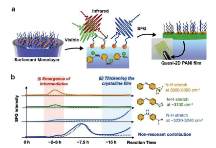 Similarly, UV–vis as well as fluorescence spectroscopy can be used as simple analytical method to detect the formation of polymer bonds. By measuring the electron transfer information in the monomer and polymer, the ultraviolet-visible spectrum can show the structural difference between the monomer and the polymer. While the fluorescence spectrum has high sensitivity and no damage to films, it can be used for detecting the formation of specific bonds. The formation of the conjugate network is indicated by the red shift of specific peaks in the UV–vis and fluorescence spectra. However, it is difficult to probe interfacial polymerization process using typical UV-visible and infrared (IR) spectroscopic techniques. Surface-specific vibrational sum-frequency generation (SFG) spectroscopy, as an interface-specific, molecular-level technique, could be used to understand the details of the on-water reaction mechanism. Seki et al. [34] clarified how the polymerization reaction occurs at the water surfaces by tracking the quasi-2D polyaniline film generation process using in situ SFG (Fig. 13a). By comparing the SOS-water and air-water interfaces, the authors revealed the charge of the surfactant monolayer on the water surface is key factor for generating highly conductive and crystalline PANI film (Fig. 13b).