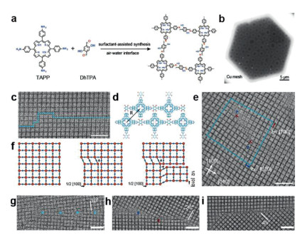 | Fig. 14. (a) Reaction scheme of Schiff-base condensation between 5,10,15,20-tetrakis(4-aminophenyl)-21H,23H-porphyrin (TAPP) and 2,5-dihydroxyterephthalaldehyde (DhTPA). (b) Scanning electron microscopy (SEM) image of the freestanding L-2D-PI thin film. (c) Antiphase boundary (APB). (d) Schematic of the APB. (e) APB bounded with partial dislocations. (f) Schematic of APB formation via two nonlinear partial dislocations. The red and blue spheres represent TAPP and DhTPA units, respectively. (g) Low-angle grain boundaries (LAGB) with a misorientation of 10°. (h) High-angle grain boundaries (HAGB) with a misorientation of 28°. (i) HAGB with a misorientation of 45°. Scale bars: 10 nm. Reproduced with permission [53]. Copyright 2020, the American Association for the Advancement of Science. | |
