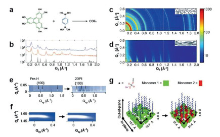 After synthesizing the oriented 2D layered COF films on SLG surfaces, Colson et al. [42] employed the GIXRD to demonstrate the structure of films (Fig. 15a), in which the substrate surface is nearly parallel to the incident beam. The synchrotron X-ray diffraction of the COF films and powders were shown in (Figs. 15c and d), and the diffraction spectrum (Fig. 15b) shows the improved crystallinity of film compared with COF powders. Similarly, GIWAXS, as an X-ray diffraction method, is perfectly suited for the investigation of the material crystallinity of surfaces and thin films. As the previous literature reported, GIWAXS can be used to demonstrate that thin films are highly crystalline and non-oriented [38], to measure the thickness of superlattice repeat units [10], and to measure the lattice constant of crystalline thin film units [31]. Compared with the SAED measurements and the DET simulation results, the polymer was measured by GIWAXS method to clarify the molecular stacking pattern of PI-2DP and verify the correctness of the results. Zhong et al. [10] used the GIWAXS technique to prove the polycrystalline structure of single-layer 2D porphyrin polymer, which also combined with the FFT image to analyze the crystal orientation and measured the crystal domain size and boundary. By collecting the information of the samples at different angles of incidence and rotation, GIWAXS can determine the orientation of the films and the direction of the internal cells according to the variation of the characteristic peaks and the signal intensity. Moreover, GIWAXS was used to gain insight polymerization mechanism before (Fig. 15e) and after (Fig. 15f) the addition of second monomer under SMAIS synthesis strategy (Fig. 15g).