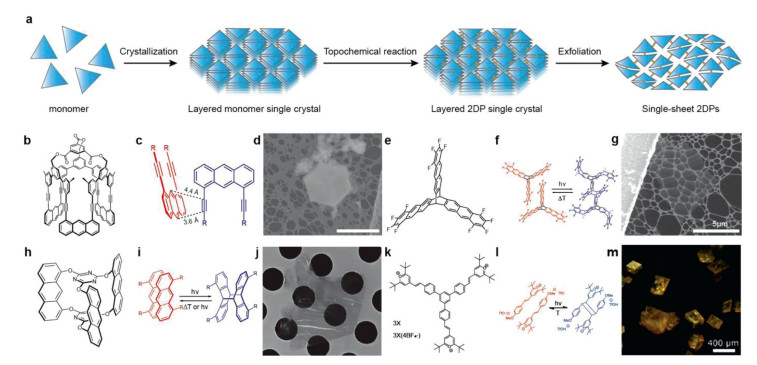 In 2013, Bhola et al. [20] synthesized a 2DPs with a pseudo-layered structure through photoinduced [4 + 4] cycloaddition dimerization using anthracene monomer (antrip). In the next year, Kissel et al. [21] prepared 2DPs by single crystal to single crystal conversion with similar monomer (Figs. 3e-g). The monomer (fantrip) is composed of three light reactive tetra-fluoranthene branches connected through a core. After two-step photopolymerization, the polymer with molecular thickness of ~1 nm and pore size of ~9 Å was synthesized. In the process of monomer conversion into a binary polymer crystal, the lattice constant of the crystal, according to the topological reaction principle, changes little and does not lead to crack generation or crystallinity reduction, and the sheet of poly(fantrip) after exfoliation shows straight edges without obvious crack.
