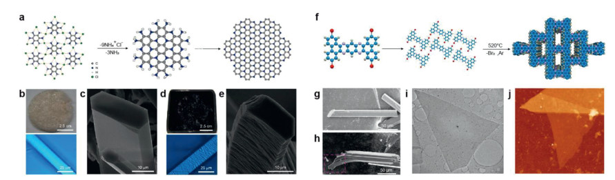 | Fig. 4. Synthesis and characterization of 2D PANI and 2D-CAP. (a) Schematic representation of 2D PANI formation. (b) Digital photograph of HAB crystals and optical microscopy image of a needle-like HAB crystal before annealing. (c) SEM image of an HAB single crystal before annealing. (d) Digital image of HAB and optical microscopy image of 2D PANI crystal after annealing at 500 ℃. (e) SEM image of a 2D PANI single crystal after annealing. Reproduced with permission [24]. Copyright 2016, National Academy of Sciences. (f) Synthesis and characterization of 2D-CAP via endogenous solid-state polymerization. (g) SEM image of 2-TBQP crystals. (h) SEM image of the as-prepared 2D-CAP crystals. (i) TEM image of an exfoliated 2D-CAP sheet. (j) Atomic force microscopy (AFM) topography of the triangular sheet. Reproduced with permission [9]. Copyright 2017, Nature Publishing Group. | |
