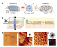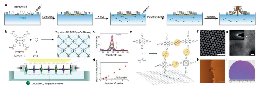 | Fig. 5. (a) Schematic illustration of chemical synthesis at air-water interface by Langmuir-Blodgett (LB) method. (b) Schematic illustration of the copper-mediated 5,10,15,20-tetrakis(4-carboxyphenyl)porphyrinato-cobalt (CoTCPP) 2D array (CoTCPP-py-Cu). (c) Ultraviolet-visible absorption spectra of NAFS-1 films. (d) Plot of maximum absorbance of the CoTCPP Soret band versus the number of film growth cycles. Reproduced with permission [8]. Copyright 2010, Nature Publishing Group. (e) Chemical structures of the monomers and 2DPs. (f) Scanning electron microscopy images of monolayer 2DPs suspended over a copper grid. (g) TEM, and (h) AFM images of a multilayer 2DPs. (i) Photographic image of monolayer 2DPs. Reproduced with permission [16]. Copyright 2016, Nature Publishing Group. | |
