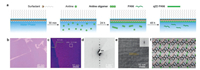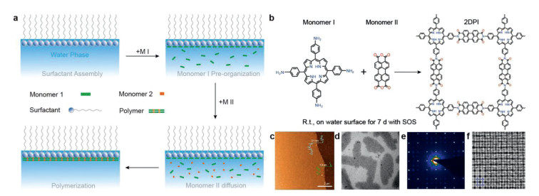 As shown in Fig. 6a, the surfactant can spontaneously assemble at the interface to form a stable structure, then the orderly and close-packed structure control the anisotropic growth of two-dimensional materials after injecting the monomers sequentially. In addition to increasing the lateral size of the product, surfactants can also assist in the synthesis of high crystallinity films with large domain sizes. In 2019, high crystallinity two-dimensional polyimide film was obtained with a thickness of ~2 nm (five layers) and an average domain size of ~3.5 µm2 by SMAIS (Figs. 6b-d) [11]. The function of the surfactant is to promote the horizontal or vertical alignment of the monomers with respect to the water surface, which in turn promotes their polymerization. The morphology, crystal structure, defects and order of the films were studied by optical microscopy, transmission electron microscopy, selected-area electron diffraction (SAED) and other methods. Based on the above techniques, the accuracy of the results was verified and the aberration corrected high-resolution electron microscopy (AC-HRTEM) images of the polymer materials were obtained (Figs. 6e and f). The crystal structure and grain boundaries of the materials were analyzed at the molecular level of resolution.