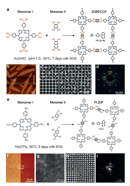 | Fig. 7. (a) A reaction scheme illustrating the synthesis of 2D BECOFs. (b) Enlarged AFM image of crystalline domains on film. (c) Enlarged HR-TEM image. Insets are lattice-averaged image calculated from the DFT and experimental electron-diffraction patterns, respectively. (d) Experimental electron-diffraction patterns. Reproduced with permission [28]. Copyright 2020, John Wiley and Sons. (e) A reaction scheme illustrating the synthesis of PI-2DP. (f) AFM image of PI-2DP. (g) TEM image showing the increased average domain size up to ~150 nm. (h) HRTEM image showing the square lattice with significantly reduced distortion (Inset: simulated HRTEM image with the atomic model overlaid). (i) SAED pattern of a single-crystalline domain along the [001] direction of PI-2DP. Reproduced with permission [29]. Copyright 2020, John Wiley and Sons. | |