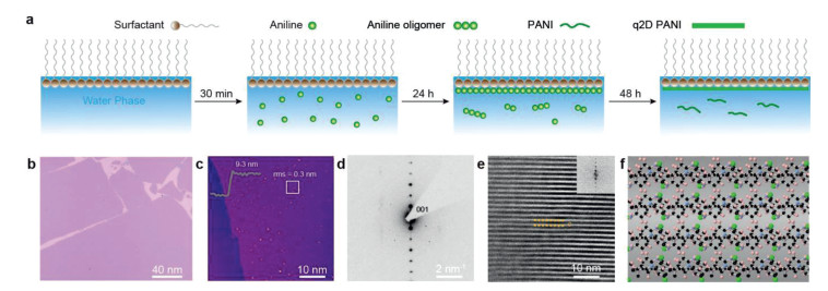 | Fig. 8. Synthesis of q2D PANI. (a) Schematic illustration of the synthetic procedure of q2D PANI: preparation of surfactant monolayer on the water surface; addition of aniline into water subphase and standing for 24 h for the diffusion of monomers to the water subphase and interface; introduction of HCl and ammonium persulfate (APS) to the water subphase; oxidative polymerization for 48 h. (b) Optical microscopy image of q2D PANI. (c) AFM image and height profile of q2D PANI. (d) SAED and (e) AC-HRTEM image of q2D PANI perpendicular to [001] axis. The two yellow lines mark out the interlayer distance c = 13.41 Å. Inset of (d) corresponding fast Fourier transform (FFT). (f) Simulated atomic structure of the q2D PANI. Reproduced with permission [31]. Copyright 2019, Nature Publishing Group. | |