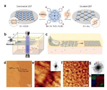 By combining the liquid-liquid interface and LB method, Zhong et al. [10] synthesized monolayer wafer-scale 2DPs film at the pentane/water interface based laminar assembly polymerization (LAP). As shown in Figs. 9a and b, the porphyrin monomers dissolved in carrier solvent were injected into the interface by micro-injection pump to form monolayers of metal organic frameworks with Cu2+ linkers or covalent organic frameworks with terephthalaldehyde linkers (Figs. 9c and d). This strategy can provide improved scalability and patterning capability over previous gas-liquid polymerization methods that formed wafer-sized covalent 2DPs [39] with good crystallinity (Figs. 9e-h). By controlling the reaction rate at the liquid-liquid interface, Dey et al. [13] synthesized the crystalline COF polymer by Schiff base polycondensation at room temperature, which employed salt-mediated technique to slow the diffusion of the precursor to obtain a thermodynamically controlled crystallization reaction. In addition, metal organic framework (MOFs) materials generally require metal ions to bind to organic ligands, and thus can be synthesized in aqueous solutions and organic solution interfaces. Dong et al. [40] reported a porous 2D MOFs film, synthesized in the interface of aqueous solution and trichloromethane solution, with direct infrared band gap of 0.25 eV and room temperature conductivity of 220 cm2 V−1 s−1.