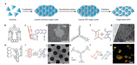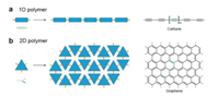 | Fig. 1. Different topologies of polymers. (a) A hypothetical linear monomer polymerizes into one dimensionally polymer. (b) A trigonal planar sp2-hybridized carbon atom polymerizes two dimensionally into graphene. Reproduced with permission [4]. Copyright 2017, Annual Reviews. | |
