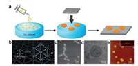 | Fig. 10. (a) Gas/liquid interfacial synthesis and microscopic observations of few-layer graphdiyne. (b) Chemical structure of hexaethynylbenzene (HEB) and graphdiyne. (c) SEM micrograph on silicon (100) modified with 1,1,1,3,3,3-hexamethyldisilazane [HMDS/Si (100)]. (d) TEM micrograph on an elastic carbon grid. (e) AFM topographic image on HMDS/Si (100) and its cross-sectional analysis along the blue line. Reproduced with permission [41]. Copyright 2017, American Chemical Society. | |