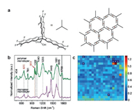 | Fig. 12. (a) Chemical structure of the monomer and the Packing model. (b) Normalized average TER spectra of monolayers of monomer and the polymer made from it deposited on Au(111). (c) Polymer TERS map measured over a 100 × 100 nm2 area with 5 × 5 nm2/pixel based on intensity ratio of the signals at 972 and 670 cm−1. Reproduced from with permission [52]. Copyright 2017, John Wiley and Sons. | |