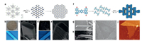 | Fig. 9. Laminar assembly polymerization. (a) Schematic of monolayer 2DPs and corresponding chemical structures of the molecular precursors. (b) Schematic of a LAP reactor and in situ optical characterization apparatus. (c) Schematic of the LAP synthesis that involves three phases. (d) AFM height image of monolayer 2DP. (e) Constant-current STM topography image of a single crystalline domain of monolayer 2DP on a thin film of Au(111) on mica. Inset: 2D FFT of the image. (f) Constant-current STM topography image of multiple crystalline domains of monolayer 2DP II. (g) 2D FFT of STM topography image showing square lattices of three major orientations. (h) Color-coded inverse 2D FFT image generated using the three sets of square lattice spots in (g). Reproduced with permission [10]. Copyright 2019, the American Association for the Advancement of Science. | |