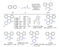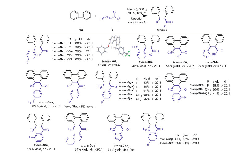 We next explored the scope of this divergent coupling system (Scheme 2). The generality of trans-products synthesis was investigated firstly. The reaction tolerated with the electron-donating or -withdrawing groups at the para position of the benzene ring in the enones with excellent regio- and diastereoselectivity (trans-3aa to trans-3ae, 79%−99% yield, dr = 19:1 to > 20:1). The configuration of trans-3ad was determined by X-ray crystallography (CCDC: 2116932). The reaction also worked smoothly for ortho-substituted methyl group (trans-3ba, 42% yield, dr > 20:1) and for pentafluorobenzyl-substituted enones (trans-3ca, 58% yield, dr > 20:1). The thiophenyl-substituted enone also worked well to give the product trans-3da in 72% yield and 17:1 dr. The reaction for the electron-withdrawing group CF3 at para-position of the benzene ring gave the corresponding product trans-3ea in 83% yield and > 20:1 dr. The bromide-substituted enone did not give desired product (trans-3fa, < 5% conc.). To our delight, when extension of the chalcones to the β-CF3 substituted enones, the reaction also worked smoothly to give the desired products. Various electron-donating and -withdrawing groups at the different position of the benzene ring tolerated (trans-3ga to trans-3na, 41%−99% yield and dr > 20:1), When the cis-enone was used, similar results with trans-enone obtained probably owing to the isomerization of cis-2ga to trans-2ga in the catalyst systems (trans-3ga, 86% yield, dr > 20:1). The naphthyl- or furyl-substituted enones all coupled with biphenylene gave the [4 + 2] annulation product with excellent diastereoselectivity (trans-3oa, 84% yield, dr > 20:1 and trans-3pa, 71% yield and dr > 20:1). The β-C2F5 substituted enones gave the corresponding products with a slight low yield (trans-3qa, 45% yield, dr > 20:1 and trans-3ra, 41% yield, dr > 20:1). However, the ethyl cinnamate was found to be unreactive.
