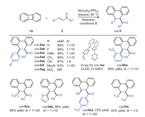 We selected biphenylene 1a and chalcone 2aa as model substrates to explore the reaction parameters (Table 1). The issues of both chemo- and diastereoselectivity arised when coupling with unsaturated alkenes comparing to the alkynes. It was found that the reaction delivered to the double bond insertion selectivity trans-product 3aa in 90% yield and excellent diastereoselective ratio (trans/cis > 20:1) with Ni(cod)2/PPh3 catalysis using the DMA as solvent (entry 1). When decreasing the temperature to 60 ℃ in the DMA solvent, the trans/cis value decreased to 9:1 (entry 2). Further study showed that the solvent effect was dramatic (entries 3–9). Low diastereoselective ratio was obtained when the DMF was used as solvent (entry 3). The starting materials were recovered with DCE as solvent (entry 4). Very interestingly, the DME, MeOtBu, THF or dioxane gave another isomer of the [4 + 2] annulation product cis-product 3aa in excellent yield, even with low diastereoselective ratio (entries 5–8). To our delight, excellent diastereoselectivity could be obtained for cis-3aa when the toluene was used as solvent (entry 9, 72% yield, trans/cis = 1:9), higher yield and dr value were obtained when the reaction temperature decreased to 60 ℃ (entry 10, 88% yield, trans: cis = 1: > 10), further decrease the temperature to 30 ℃ in toluene led to low efficiency (entry 11). Up to now, the solvent-controlled diastereodivergent [4 + 2] cycloaddition system was established, in which the trans-3aa was obtained in polar solvent DMA (entry 1, 90% yield, trans: cis > 20:1) and cis-3aa was obtained in toluene (entry 10, 88% yield, trans: cis = 1: > 10). Noteworthy, these reaction conditions only afforded the C=C insertion products. Other ligands such as Bpy or rac-BINAP did not promote the annulation (entries 12 and 13), and no corresponding products observed without the addition of PPh3 (entries 14 and 15). Our control experiments also showed that the Ni(cod)2 was essential for the transformation (entry 16).
