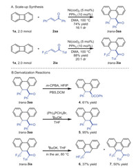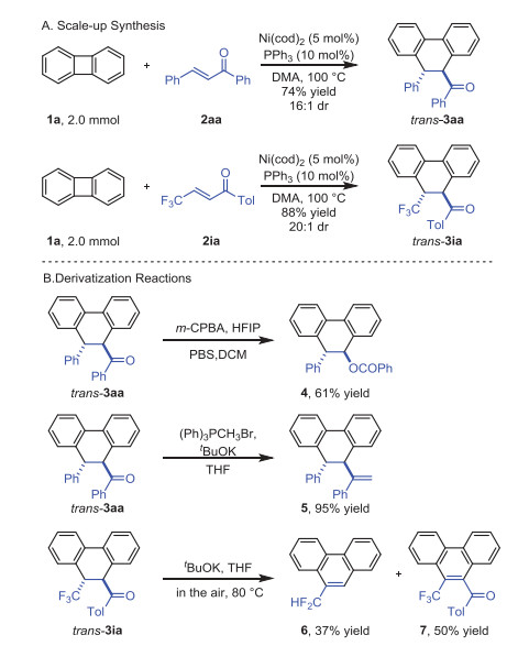The synthetically useful of this [4 + 2] annulation system was briefly investigated (Scheme 4). The coupling of 1a and 2aa was readily scaled up to 2.0 mmol, affording the product trans-3aa in excellent yield and diastereoselectivity. Similarly, the β-CF3 substituted enone 2ia could also be scale up to 2.0 mmol (Scheme 4A). The ester 4 was obtained in 61% yield through Baeyer-Villiger oxidation of trans-3aa. Wittig reaction of trans-3aa gave the olefination product 5 in 95% yield. These two transformations with the retention of the trans configuration. Interestingly, when the CF3-substituted dihydrophenanthrene trans-3ia was treated with tBuOK, CF2H-substituted phenanthrene 6 (37% yield) and CF3-substituted phenanthrene 7 (50% yield) were obtained in one pot under the air atmosphere (Scheme 4B).
