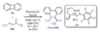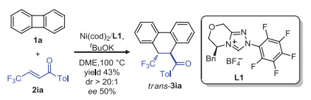 We initially realized the enantioselective variant of this C—C activation system of biphenylene using β-CF3 substituted enone 2ia as coupling partner (Scheme 5). With the chiral NHC ligand L1, the desired [4 + 2] annulation product trans-3ia was obtained in 43% yield and 50% ee.