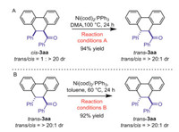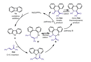 On the basis of previous reports on the transition-metal catalyzed ring-opening of biphenylenes [32-51], a plausible pathway is proposed (Scheme 7). Oxidative addition of biphenylene 1a to Ni(0) afforded the intermediate A. The double bond of enone coordinated to the nickel center, which is proposed to undergo Ni-C insertion into the C=C bond of 2aa to generate the intermediate B. The intermediate B could isomerize to intermediate B', followed by reductive elimination to give the kinetic product cis-3aa in toluene solvent and regenerated the catalyst. The high steric hindrance for the cis-isomer might benefit the reductive elimination process from the intermediate B in the toluene solvent [58-60]. The cis-3aa could isomerized to thermodynamic product trans-3aa in DMA solvent (pathway A). Right now, we could not exclude the pathway of direct generation of trans-3aa from the intermediate B in DMA solvent (pathway B).