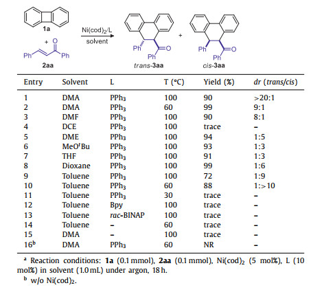 In summary, we have realized Ni(0)-catalyzed diastereodivergent [4 + 2] annulation of biphenylene with enones via C—C bond activation. This reaction allows efficient access to the two diastereoisomers of the annulation products from the same starting materials just changing the reaction conditions. This solvent-controlled reaction proceeded with highly diastereoselectivity for both isomers (> 20:1 dr) and the C=C bond formally insertion chemoselectively in this cycloaddition. This intermolecular coupling system would be a straightforward strategy for the synthesis of 9, 10-dihydrophenanthrene derivatives.