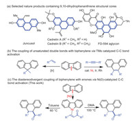 9, 10-Dihydrophenanthrene derivatives are not only ubiquitous motifs in the natural products and bioactive compounds, but also important synthetic intermediates [1-6]. For example, Juncusol was isolated from the nature plant and exhibit anticancer and antimicrobial activity [7-9]. Cedrelin A was isolated from the bark of Cedrelinga catenaeformis Duke and has cytotoxic activity against Staphylococcus aureus and Bacillus subtilis [10-13]. The natural product FD-594 aglycon containing the trans-dihydrophenanthrene-diol units (Scheme 1a) [14-16]. Although 9, 10-dihydrophenanthrene could be synthesized through the transformation of aryns [17-20], transition-metal catalyst annulation reactions [21-26] and others [27-31], the divergent synthesis of these structures from the same starting materials just with different reaction conditions will be much more interesting and attractive.