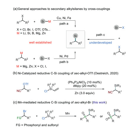 Alkylsilanes are key structural motifs in many functional molecules, and they have found broad applications in organic synthesis, material science, and medicinal chemistry [1-4]. The streamlined synthetic approaches to these compounds involve the treatment of alkyl Grignard/lithium reagents with chlorosilanes [5] and catalytic hydrosilylation of alkenes [6-10]. Despite formidable advances, several challenges remain, involving the construction of secondary alkylsilanes [11-16]. Transition-metal-catalyzed C–Si coupling offers an attractive solution to this problem [17-25]. For example, the groups of Oestreich and Fu and others have recently reported several elegant works on the synthesis of alkylsilanes by coupling of secondary alkyl electrophiles with silylmetallic species (e.g., Si–M, M = Li, B, Mg and Zn) (Scheme 1a, path a) [26-33]. Meanwhile, Watson and coworkers have achieved the couplings of alkyl Grignard and Zinc reagents with silyl electrophiles (Scheme 1a, path b) [34, 35]. Alternatively, the reaction of carbon and silyl electrophiles may deliver the same compounds by using more readily available chemicals, but it remains largely unexplored (Scheme 1a, path c).