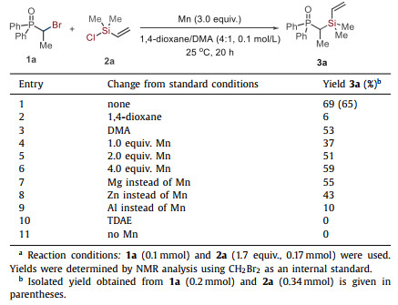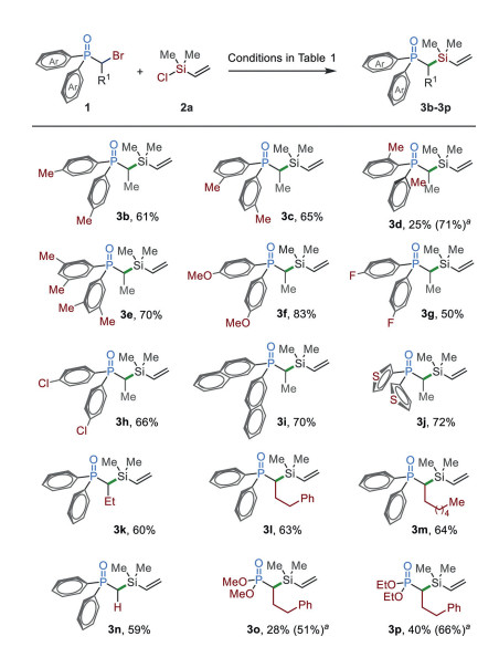 We started our investigation by studying the reaction of α-bromo phosphorus 1a with chlorosilane 2a (Table 1). We found the treatment of them with Mn (3.0 equiv.) in 1, 4-dioxane/DMA (4:1, 0.1 mol/L) gave the desired product 3a in 65% isolated yield (entry 1). The nitrogen solvent is essential to the success of this reaction, but the addition of 1, 4-dioxane improved the yield from 53% to 69% (entries 1–3). Lowing the loading of Mn resulted in decreased yields of 3a; the use of Mn (4.0 equiv.) did not improve the reaction efficiency (entries 4–6). The use of other metal reductants also delivered the target product but gave relatively lower yields (entries 7–9). No reaction was observed in the presence of an organic reductant, TDAE, or in the absence of Mn (entries 10 and 11).