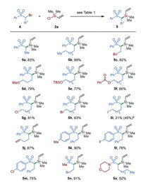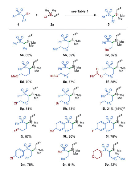 | Scheme 3. The substrate scope of α-bromo sulfones. The reaction conditions as shown in Table 1; bromide 4 (0.2 mmol) and chlorosilane 2a (0.28 mmol) were used; reaction at 15 ℃ for 20 h; isolated yields are given. aNiI2 (5 mol%) was added. | |