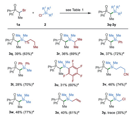 | Scheme 2. The substrate scope of α-bromo organophosphorus. The reaction conditions as shown in Table 1. Bromide 1 (0.2 mmol) and chlorosilanes 2a (0.34 mmol) were used; isolated yields are given. a NiI2 (5 mol%) was added. | |
