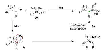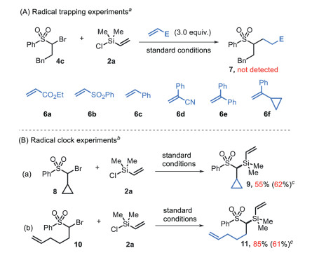 To insight into the mechanism of this process, several control experiments were performed. (1) In the presence of Michael acceptors 6a-6f (3.0 equiv.), the reactions proceeded well to afford the desired product in 58%−76% yields (see Scheme S1 in Supporting information for details), and they did not result in any radical trapping product 7 (Scheme 5A). (2) The reaction of α-cyclopropyl substrate 8 afforded the directly coupling product 9 in 55% yield with no ring-opening derivative was observed (Scheme 5B-a). (3) The reaction of bromo(pent-4-en-1-yl)sulfone gave silylated product 11 in 85% yield and did not result in any cyclized side-product (Scheme 5B-b). Similar results were also obtained in the presence of nickel (Scheme 5B). These results suggest that a free radical is not generated in this process.