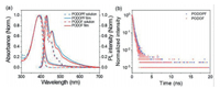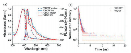 | Fig. 2. (a) The absorption and PL spectra of PODOPF and PODOF film and diluted toluene solution (10-3 g/L). (b) The fluorescent lifetime of PODOPF and PODOF. | |