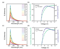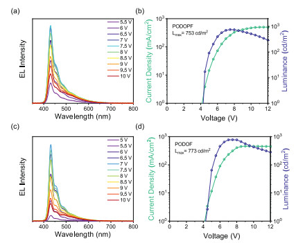 | Fig. 3. (a) EL spectrum of PODOPF. (b) Current density and luminance versus driving voltage characteristics of PODOPF. (c) EL spectrum of PODOF. (d) Current density and luminance versus driving voltage characteristics of PODOF. | |