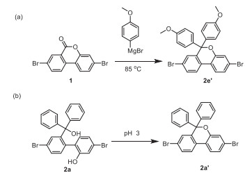 In the previous synthetic route (Scheme 2), the limited variety of Grignard's reagents may be the major obstacle to obtain the number of 9-site substituents while introducing the modifiable substitution to 4-site. As listed in Scheme 2, several monomers with different substitutions at 4- and 9-site were prepared by the traditional synthetic route. Although organolithium reagents can expand the selectivity of the 9-site substituents, strong electron donating of 9-site units may lead to a dehydration product. The target product 2 cannot be obtained by the previous synthetic route. As presented in Scheme 3a, product 2e' (88% yield) was gained by adding (4-methoxyphenyl) magnesium bromide to compound 1 at 85 ℃. For compound 2, the strong electron-donated substituents on the tertiary carbon may increase the leaving ability of the tertiary hydroxyl group, thus the dehydration products are formed. To verify our assumption, 2a was put in an acidic condition to leave the tertiary hydroxyl group. As displayed in Scheme 3b, 2a was solved by dichloromethane and stirred with an aqueous hydrochloric acid solution with pH 3, and 2a was completely reacted to form 2a' after 1 h (characterized by 1H NMR, Fig. S12 in Supporting information). This result suggested that while the leaving ability of the tertiary hydroxyl group is enhanced, it is easy to dehydrate with the hydroxyl group at 2-site and obtain the dehydration product. For the double 9-substituted of fluorene, the dehydration reaction caused by strong electron donating groups is the greatest difficulty in the previous synthetic route. Beyond that, asymmetric substitutions at 9-site are also difficult to achieve via the previous synthetic route (Scheme 2). Therefore, a new synthetic method to obtain a novel 4-aualifiable building block is necessary to explore for constructing a series of fluorene-based conjugated molecules.
