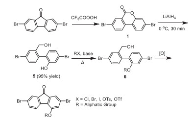 Up to date, most of fluorene-based materials are obtained from original products, such as fluorene (obtained from coke tar) or fluorenone building blocks. The common synthetic route of 9-substituted fluorene has been shown in Schemes 1a-c. These general methods can effectively extend the number of substituents at 9-site and endow polymers with unique properties, such as the β-conformation of PFO [33-35]. However, only the substituents at 9-site exposes the other side that may create an intermolecular electronic coupling in the aggregation state. The formation of the residual aggregation defects is harmful to the emission spectral stability and property of deep-blue light-emitting films and devices. Fortunately, the modifiable 4-substituted fluorene was broadened by Baeyer-Villeger oxidative rearrangement (Scheme 2). The synergistic effect of 4- and 9-substituents may endow materials unique photophysical properties. A typical polyfluorene, PODPF, with an octyloxy substituent at 4-site, has been explored and proved to have a unique β-conformation and good stability [36-38]. The further investigation also suggested that 4-substituted fluorene is of great significance to the basic research and development of optoelectronics and flexible electronics [22, 29, 30, 39, 40]. Nevertheless, after extensive experiments we also found that this synthetic route has its intrinsic defects that the type of 9-site substituents is extremely limited. Therefore, it is of great importance for developing optoelectronics and flexible electronics to explore a new synthetic route to construct a building block that can keep the number of 9-site substituents while introducing the modifiable substituents at 4-site.