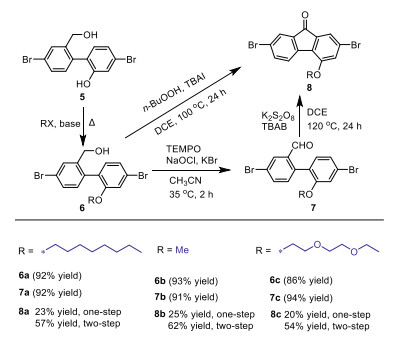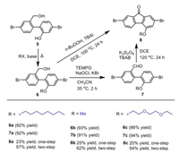 Subsequently, novel 4-modifiable fluorene building blocks are developed by new preparative route, as shown in Scheme 4. This synthetic route contains three main steps, Baeyer-Villeger oxidative rearrangement, reduction ring-open reaction and oxidation cyclization reaction. A potential 4-site can be generated by the Baeyer-Villeger oxidative rearrangement. The reduction ring-open reaction is positive to release the 4-site for subsequent modification, and the oxidation cyclization reaction will finally form the building block with 4-site substituents. In the ring-open reaction (Scheme 4), 1 (1.06 g, 3 mmol) was solved in THF (15 mL) in nitrogen, then 6 mL THF solution of LiAlH4 (1 mol/L, 2 equiv.) was added into the mixture. After stirred for 30 min, the mixture was quenched by 100 mL hydrochloric acid aqueous solution (0.25 mol/L) to give 5 in 98% yield. In this reaction, long reaction time under a high temperature may result into the formation of excessive by-products, that the bromine atoms may be reduced to hydrogen. In the subsequent 4-site substitution reaction, the yield of 6a-6c was 86%~92%. Besides, we also explored two kinds of oxidation cyclization, one-step [41] and two-step oxidation cyclization [42]. As shown in Scheme 5, in one-step cyclization reaction, 3 equiv. of n-BuOOH and 0.1 equiv. of TBAI were stirred with 6 in DCE at 100 ℃. However, the yield of 8 was only 20%~25%. In the two-step cyclization, first 0.1 equiv. of TEMPO and 1.2 equiv. of NaOCl were used to oxidize 6 to 7. The yield of 7 was more than 90%. In the subsequent cyclization reaction, 0.1 equiv. of TBAB and 1.2 equiv. of K2S2O8 were stirred with 7, providing 8 in 54%~62% yield. The total yield of 8 from two-step oxidation and cyclization reaction was 51%~56%, which is more than twice the yield of one-step oxidation cyclization. Therefore, the building block with a 4-site substituent was successfully prepared by oxidation-reduction-oxidation method, and the total yield can be 38%~46% from 2, 7-dibromo-9H-fluoren-9-one to the building block with 4-site substituent.
