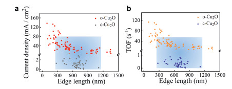 | Fig. 4. (a) Current density and (b) calculated TOF of OER at 1.97 V vs. RHE at individual o-Cu2O and c-Cu2O nanoparticles with different edge length. | |