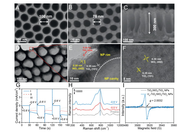 | Fig. 1. SEM images of (A) TiO2NPs and (B, C) TiO2/WO3/TiO2NPs. (D) TEM, HAADF-STEM (inset), and (E, F) HR-TEM images of TiO2/WO3/TiO2NPs. (G) Current density vs. time curves of TiO2NPs (I), TiO2/TiO2NPs (II), and TiO2/WO3/TiO2NPs (Ⅲ) acquired during potential pulse cycling in a voltage range from –0.8 V to +0.8 V. (H) SERS spectra of TiO2/WO3/TiO2NPs after applying different bias voltage. (I) EPR spectra of TiO2/WO3/TiO2NPs and VO-TiO2/WO3/TiO2NPs. | |