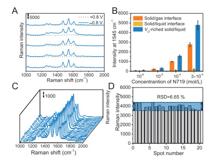The role of VO on the SERS signal of the substrates was further investigated by repeatedly applying positive and negative voltages cycles. In Fig. 3A, an enhanced N719 signal can be observed when applying the voltage of −0.8 V. In turn, switching the voltage to +0.8 V causes the weak Raman signals. The repeatable SERS activities were achieved by switching the voltages back to −0.8 V, verifying the VO can be electrochemically tuned with satisfactory feasibility and reproducibility. Meanwhile, these results also allow one to conclude whether the weakened SERS activity is derived from the vanishing of VO rather than from the shedding or desorption of N719 molecules from the substrates.