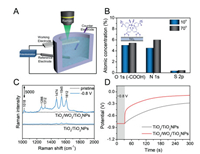 | Fig. 2. (A) Schematic of the electrochemical-SERS setup used in this study. (B) Atomic concentrations of N719 modified TiO2/WO3/TiO2NPs at take-off angles of 10° and 70° (inset: orientation of N719 on the sample). (C) SERS spectra of N719 (3 × 10−3 mol/L) on pristine and VO-contained TiO2/WO3/TiO2NPs and TiO2/TiO2NPs. (D) Potential recovery of TiO2/TiO2NPs and TiO2/WO3/TiO2NPs after applying the negative bias voltage of −0.8 V for 30 s. | |