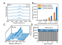 | Fig. 3. (A) SERS spectra of N719 adsorbed on TiO2/WO3/TiO2NPs after exposed to the bias voltages of −0.8 V and +0.8 V alternately. (B) Raman intensity (at 1545 cm−1) of N719 on TiO2/WO3/TiO2NPs measured in air and in liquid. (C) SERS spectra of N719 collected from 20 randomly selected positions on VO-TiO2/WO3/TiO2NPs. (D) Intensity variation of the Raman peak at 1545 cm−1 in these 20 selected positions. | |