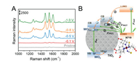 | Fig. 4. (A) SERS spectra of N719 on TiO2/WO3/TiO2NPs before and after exposure to different bias voltages. (B) Schematic energy level diagram and CT pathways in the N719-VO-TiO2/WO3/TiO2NPs system. | |